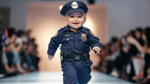 A super cute baby with a beaming smile, walking confidently on a runway, perfect for a TikTok aesthetic, dressed in a tiny police officer’s uniform. The outfit features a navy-blue shirt and pants, complete with a small police badge on the chest and a tiny cap to match. The baby is seen in a full-body view from head to toe, grinning joyfully while presenting a bold and adorable look. The background is set like a contemporary fashion show, with dynamic, urban lighting that highlights the uniform’s authoritative design. The audience on both sides of the runway is smiling and taking photos, charmed by the baby’s joyful and police-inspired style. --ar 16:9