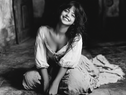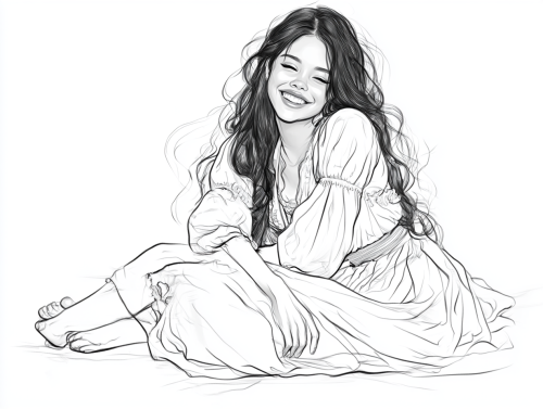 42 year old half-korean Selena Gomez, dressed as a 16th century peasant girl in skirt and bluse, smiling sitting on the floor and holding her knees, simple line drawing --ar 4:3