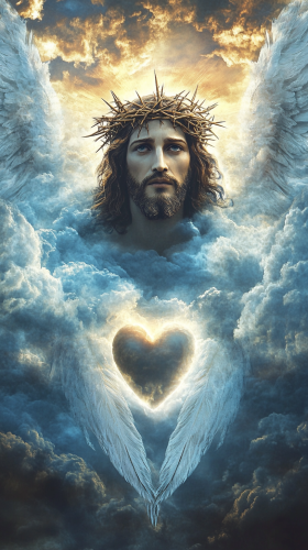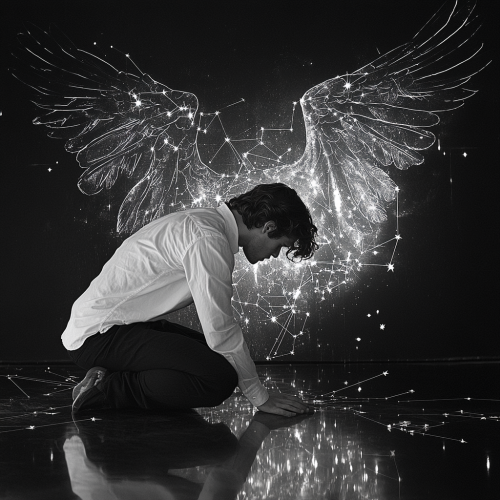 brunette man kneeling down and looking at his reflection, stars and constellations inside the reflection, upside down photo, photography. Outline of angel wings behind him