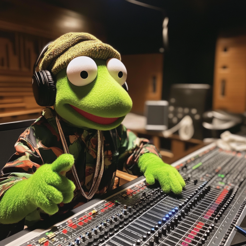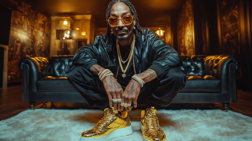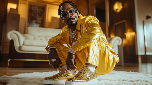 Snoop Dog kneeling down showing off his gold gucci sneaker laces, wearing diamonds & heavy gold jewelry, ultra modern room super luxurious style room, black leather couch white thick rugs modern fixtures, gold ambient lighting dark background --ar 16:9 --s 250