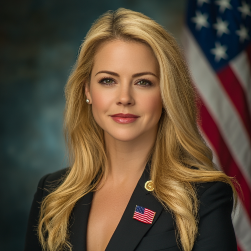 An official congressional portrait of Melissa Joan Hart, who is wearing a very small American flag lapel. There is an American flag in the background. Portrait photography, photorealistic, natural.