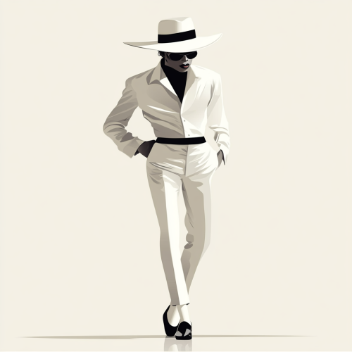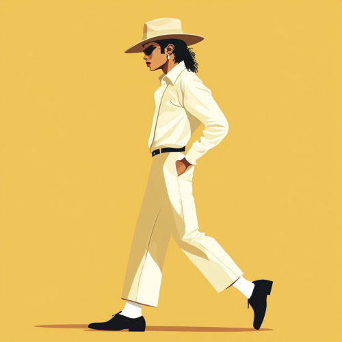Michael Jackson, full-body action, flamboyant poses, vector illustration, wide-brimmed gentleman's hat covering half of the face, white shirt with high-waisted cropped pants, white socks with black shoes, no extra accessories, clean and sharp, limited to 5 colors