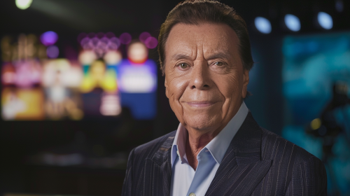 Uma fotografia de Silvio Santos, ícone do SBT, mostrando a língua para a televisão, com uma expressão brincalhona e descontraída. O cenário é um estúdio de TV moderno, com luzes brilhantes ao fundo e reflexos suaves no chão. Silvio Santos está de frente para a câmera, em um ângulo ligeiramente de baixo para cima, enfatizando sua postura carismática e o gesto ousado. As cores do fundo são suaves, predominando o azul e o branco, com iluminação de estúdio profissional, capturada com uma câmera DSLR de alta resolução, estilo realista. hd quality, natural look --ar 16:9 --v 6.0