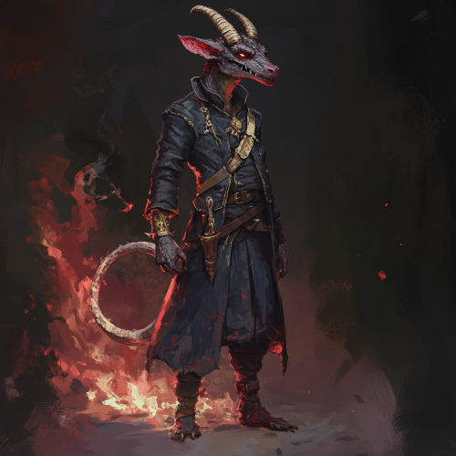 A tall, slim kobold with red scales, resembling a teenager. His form is twisted with devilish features--one large, curved horn on the right side of his head, and the legs of a goat with dark, cloven hooves. He wears a long, tattered captain's jacket that flares dramatically at the edges, trailing behind him. The jacket is worn, dark blue with gold accents, and slightly too large, giving a rakish look. His forked tongue hangs lazily out of his mouth, giving a mischievous and slightly unsettling appearance. His eyes glow with a faint, infernal light, and his expression is a mix of playful mischief and subtle menace. He holds a small, twisted staff with infernal runes. The background is a dark, mystical setting with flickering red embers and shadows, emphasizing his infernal pact and warlock nature.