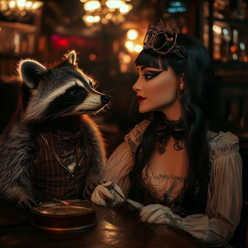 Anya Taylor Joy with long black hair in a cabaret outfit, sitting at a cabaret style bar and talking with a raccoon dressed in nerdy clothes wearing reading glasses
