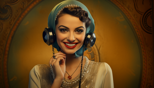 arab Advertisement with an Old - style telephone operator smiling with a touch - tone telephone in her hand wearing pearls --ar 7:4