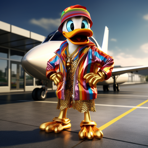 3D cartoon rendered image of the Donald Duck wearing a rainbow colored maxi dress that comes down to his knees. The Duck has a thick gold cuban link chain around his neck , a red beanie hat, gold watch and tall gold stilettos on his feet. The Duck is walking through terminal of Atlanta Hartfield airport like a runway model