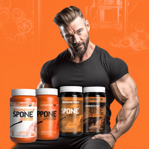 website banner featuring 2 fitness supplements and a famous bodybuilder, orange branding --v 5.0