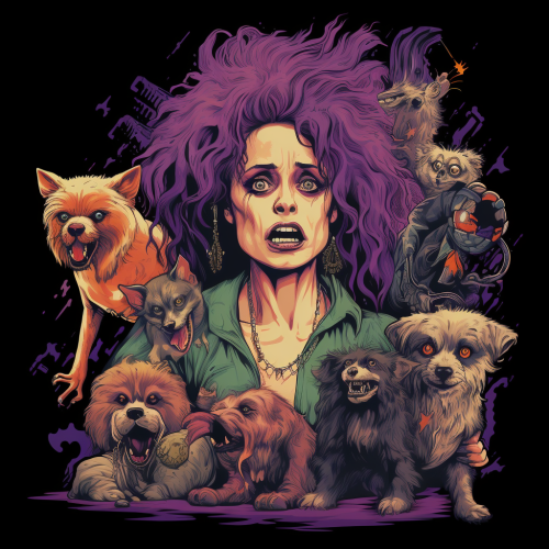 helena bonham carter with purple hair wearing a shirt that says BINKUM. there is a rabid chihuaua snarling next to her