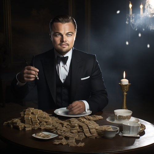 Create an image of Leonardo DiCaprio, dressed elegantly, while eating dollars. --v 5.2