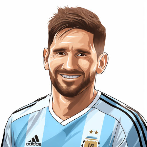 cartoon animated headshot of lionel messi smiling wearing a light blue jersey isolated on a white background