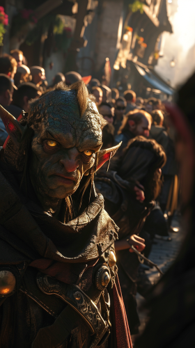 file:///C:/DATA/JDR/AEDEN%20-%20H&D%20-%20Campagne%20L'Heure%20du%20Changement/midjourney/Territoires/Cit%C3%A9s%20Unifi%C3%A9es%20du%20Sud/blueh0riz0njdr_the_same_creature_in_dark_fantasy_style._cinemat_9ac378a2-04e4-40d8-b168-c9484585e677-remix.png A view of this character in an adventurer's outfit in a crowd. he's got golden eyes. the eyes are golden and coppery. Eyes are magnetic. should be tapered like elves. he is talking conspiratorially with another character. pan and scan view. drak fantasy style --ar 9:16 --v 6.0