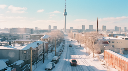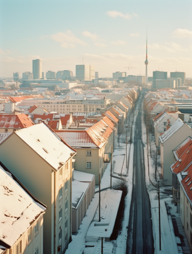 Berlin city, germany, Skyline, Winter, blue sky, sunshine, snow on roofs an streets, soft lighting, analog photography, sharp focus, Kodak Ektar 100, --v 5.1 --ar 3:4