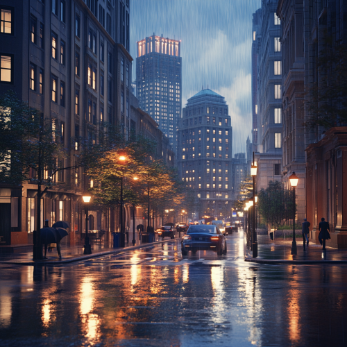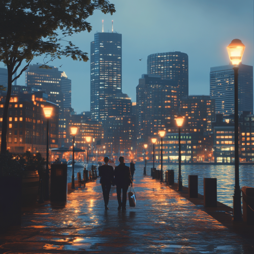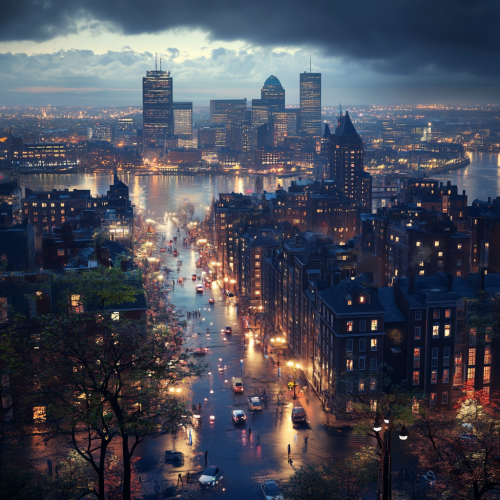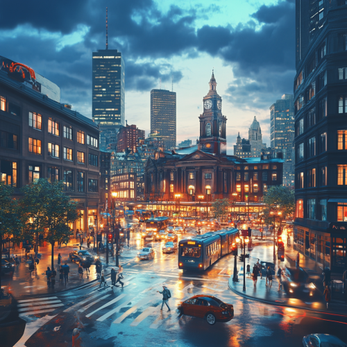 What Boston looks like, fascinating, 2024s, imaginative, realistic, photographic of the city of Boston, background Boston city view, incredible, creative, square 3d render, city lights, beautiful and handsome American people, rainy day