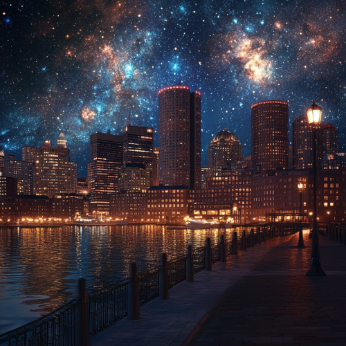 What Boston looks like, fascinating, 2024s, imaginative, realistic, photographic of the city of Boston, background Boston city view, incredible, creative, city 3d render, city lights, beautiful and handsome American people, night, stars