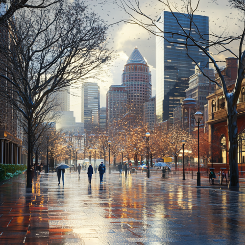 What Boston looks like, fascinating, 2024s, imaginative, realistic, photographic of the city of Boston, background Boston city view, incredible, creative, city 3d render, city lights, nowadays a day, Boston winter flowers, rain in sunny weather, families walking on the street