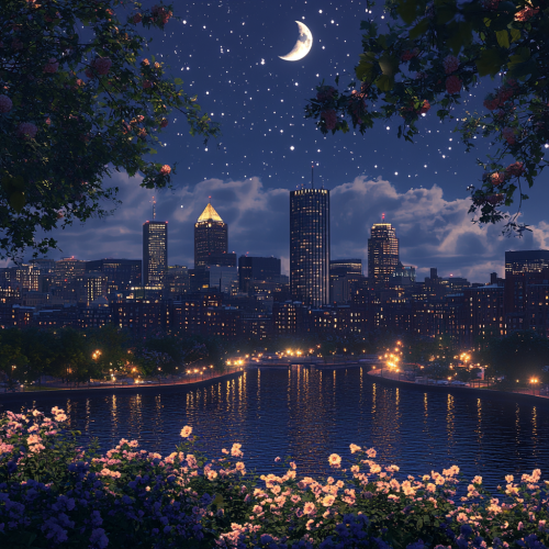 What Boston looks like, fascinating, 2024s, imaginative, realistic, photographic of the city of Boston, background Boston city view, incredible, creative, city 3d render, city lights, nowadays a day, night, half moon, star, Boston summer spring flowers