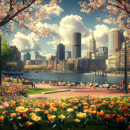 What Boston looks like, fascinating, 2024s, imaginative, realistic, photographic of the city of Boston, background Boston city view, incredible, creative, traffic in the city square 3d render, city lights, beautiful and handsome American people sunbathing by the sea, nowadays a day, spring flowers
