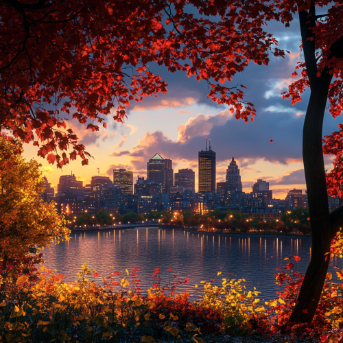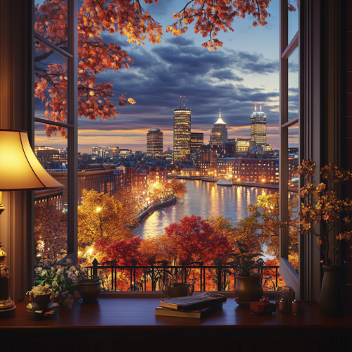 What Boston looks like, fascinating, 2024s, imaginative, realistic, photographic of the city of Boston, background Boston city view, incredible, creative, city 3d render, city lights, nowadays a day, Boston summer flowers, magneficent sunset