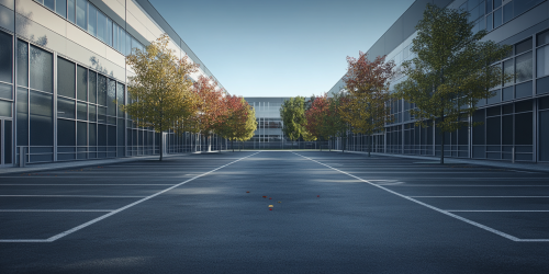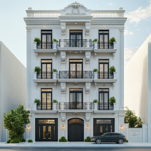 Close-out front view of an 8-level classical design building, 22 meters wide, with a penthouse on the top floor. The ground floor has plants on the left and a car entrance road on the right. Each floor has 2 residential units, with two classic balconies extending from the facade. The penthouse features plants on its terrace. Include both sides of the neighboring buildings in the scene.