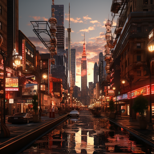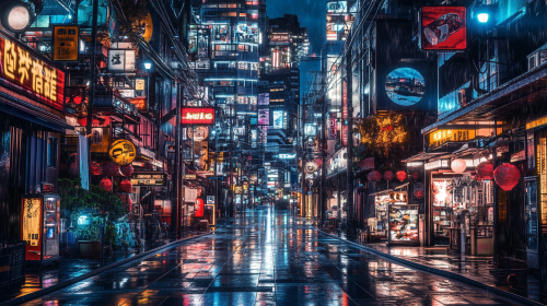 a futuristic cyberpunk city street. hyper realistic, detailed, high resolution, high detail, hyper quality, stylish, cinematic, poster, photo, magazine cover, movie poster, film camera, photography, 35mm lens, f/20, shutter speed 4s --ar 16:9