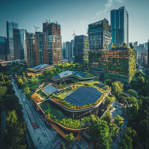 A wide-angle cityscape of a futuristic, fully sustainable city, showcasing green rooftops, solar panels, wind turbines, and eco-friendly public spaces, with a prominent, ultra-modern building as the centerpiece, featuring innovative design with glass, steel, and vertical gardens, bustling with people and electric vehicles, in bright daylight, shot with a Sony A7R IV, 28mm lens, vibrant colors highlighting greens and blue