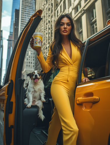 low angle kendall jenner getting out of a new york taxi in manhatten holding a bubble tea in one hand and a little dog in the other, realistic photography, --ar 3:4