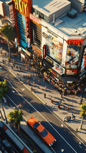 nintendo gamecube style graphics like crazy taxi for a first person game running through a city, theres a sneaker store with a line of people outside, y2k style graphics, 3d gaming, camera angle from slightly above user --ar 9:16