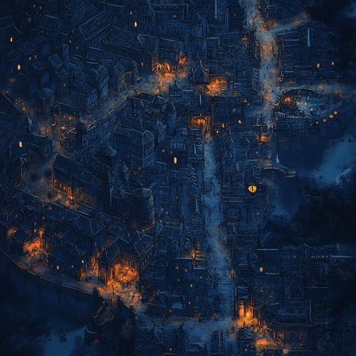 a map of a large, dense, medieval city for a dnd campaign. It should look dark and foreboding. Use plenty of dark blue colours with sporadic amounts of Amber to illuminate the streets.