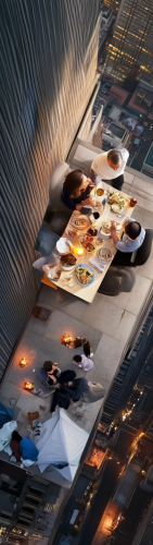 Drone photo from above of a billionaire high-class couple having a five-star dinner at a table on a skyscraper terrace. Below, the city streets filled with poor and homeless people are visible. There are tents and cooking fires visible below among the homeless people. --ar 9:32 --quality .5 --style raw --stylize 0