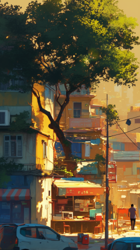 imagine you are standing right opposite an indian street from the opposite street shop, you can see the road below in the foreground going accross perpendicularly and you can see a tree on the left hand side slightly covering the shops --ar 9:16 --niji 6