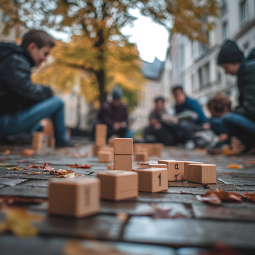 photography of a teambuilding in the city of luxembourg as an enigma game, outdoor groupe of 20, teaser photography, daily ambiance, photo highly realistic shot on Canon EOS R5, 35mm