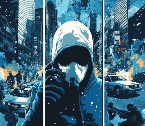 A movie poster design about a action movie with 3 box panels in blue that has images of the characters from the film, like an action man wearing a white ski mask making a phone call with a large cityscape in the background. There are also some other small action shots of people fighting or being shot at by police cars on both sides of the shirt. The overall feel should be gritty but cinematic, like Michael Mann meets Gotham City, and the color palette will feature navy blues, greys, whites, and hints of red. there is nothing outside the 3 box panels all the art should be inside the box --ar 54:47