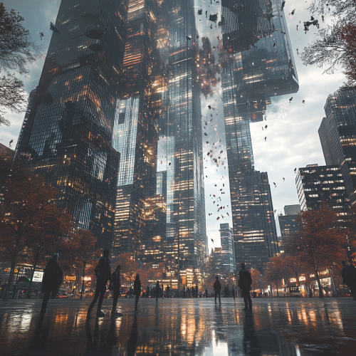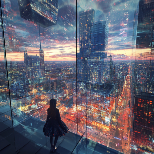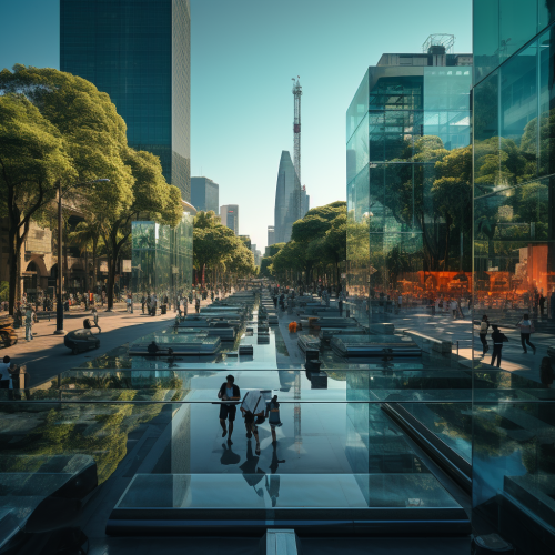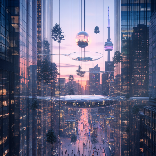 How does Toronto look in the distant future, fascinating, 7000s, creative, realistic, photographic of Toronto city, incredible, city city square 3D rendering, glass skyscraper, different perspective, different perspective, Canadian people, city lights,upside down city, upside down trees, glass people, mirror