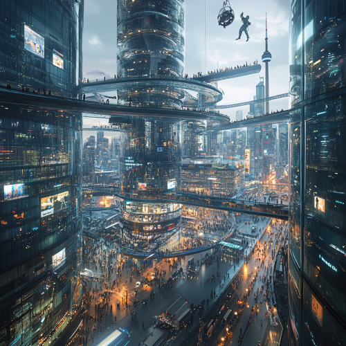 How does Toronto look in the distant future, fascinating, 7000s, creative, realistic, photographic of Toronto city, incredible, city city square 3D rendering, glass skyscraper, different perspective, different perspective, Canadian people, city lights,3d rendering glass roads, rollcoaster, people hanging in the air, robot