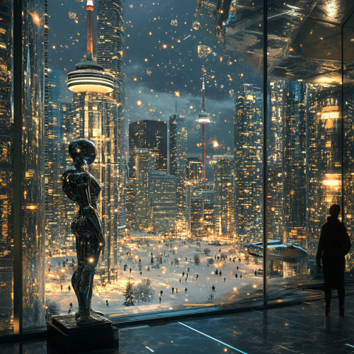How does Toronto look in the distant future, fascinating, 7000s, creative, realistic, photographic of Toronto city, incredible, city square 3D rendering, skyscraper, different perspective, Italian people, city lights, golden crystalline snowflakes, winter, glass statue, Detailed humanoid robot watching the view outside through the window, stars