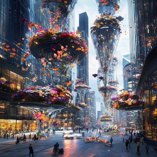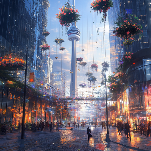 How does Toronto look in the distant future, fascinating, 7000s, creative, realistic, photographic of Toronto city, incredible, city city square 3D rendering, glass skyscraper, different perspective, different perspective, Canadian people, city lights,3d rendering diamonds rainbow, rain, glass elevator hanging in the air, flowers