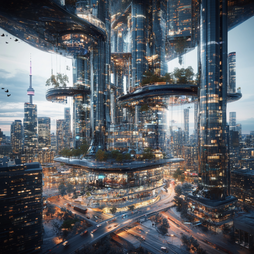 How does Toronto look in the distant future, fascinating, 7000s, creative, realistic, photographic of Toronto city, incredible, city city square 3D rendering, glass skyscraper, different perspective, different perspective, Canadian people, city lights,3d rendering glass and winding roads, trees and houses hanging in the air, robots, half sun half moon