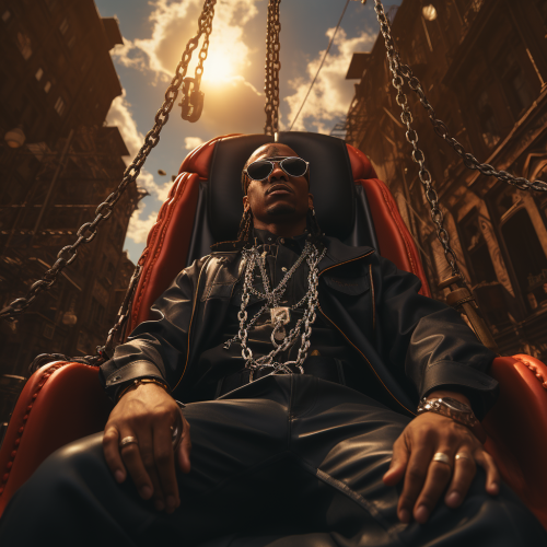 a large slingshot, a young Black man loaded into the slingshot, background setting is NYC, album cover art in the style of 90s No Limit Records, photorealistic, ultra-wide shot --s 750