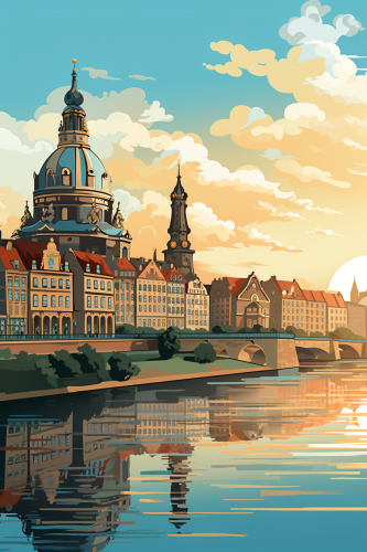 art deco inspired cityscape, smooth evening sky no clouds, rich warm colors, vector style, --ar 15:7 --no cars or people