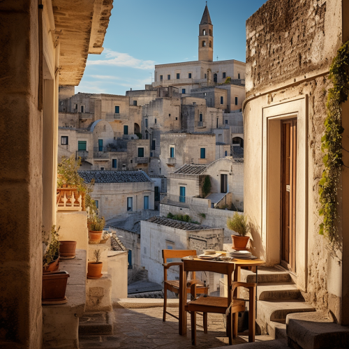 California style city by the ocean, with modern buildings in the foreground, and ancient destroyed buildings in the background up on a hill, fantasy, illustrated, cinematic, --ar 16:9