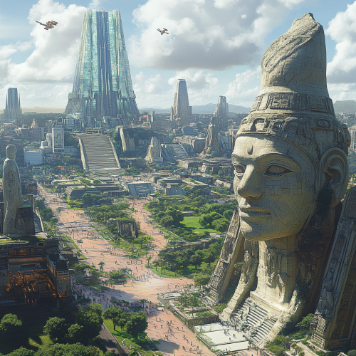 Picture, if you will, a vast city of our modern age, but with its heart rooted deep in the ancient soil of Olmec genius. Great glass towers rise high, shimmering in the sunlight, but beside them stand mighty monuments, carved of stone, straight out of the days when men first thought to chip their histories into rock. In the center of bustling plazas, you’ll find colossal basalt heads, solemn sentinels from San Lorenzo’s glory days, watching over the hum of modern life. Broad avenues stretch out in a careful design, their paths laid long ago by hands that shaped the first cities, with stepped pyramids now soaring into the sky--though these are made of steel and stone, polished and adorned with carvings that whisper of the past. In this city, the old and the new shake hands, and they do it well. Green parks, where nature reclaims her space, meet the clean, sharp lines of progress. It’s all here--natural stone, modern steel, ancient wisdom, and futuristic dreams--all woven together so neatly, you’d think the Olmecs had a hand in the blueprint. The Nikon captures it all, as clear and real as the nose on your face--each detail crisp, each color vibrant, with the light falling just so, showing the world how the past and the future, though separated by centuries, can walk together just fine. --v 6.1