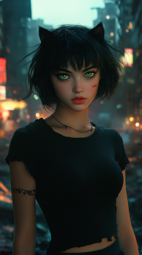 anime style. Beautiful young woman. Slight build. Short black hair. Green feline eyes. Light black t-shirt. Night background. Destroyed city background. Cinematic, 35mm lens, uplight, global illumination. --v 6.1 --ar 9:16