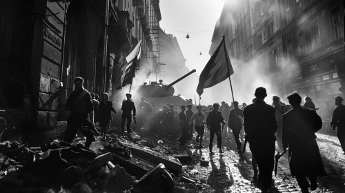 A black and white photograph of Budapest during the 1956 uprising, people rushing through the streets with makeshift barricades, Soviet tanks in the distance, Hungarian flags without their communist emblem flying high, taken from a street-level perspective, with dramatic lighting and deep shadows, sharp contrast, historical photojournalism style, film grain texture, intense expressions, gritty urban setting, HD quality, natural look --ar 16:9 --v 6.0