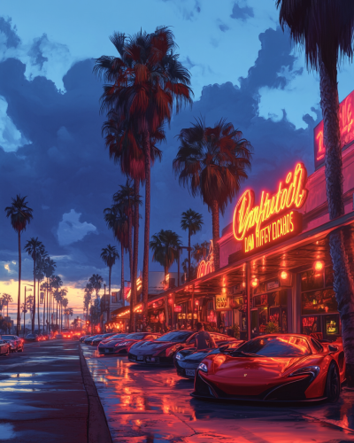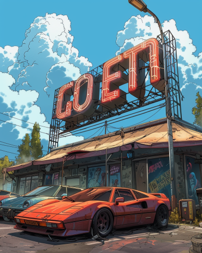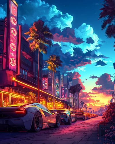 a high resolution cartoon style illustration of downtown night club with a neon sign, a line of sports cars parked outside , blue sky, white clouds, afternoon, rendered in a colorful cartoon style, with bright colors and clear lines , well detailed, colorful, eye pleasing --s 500 --v 6.1 --ar 4:5