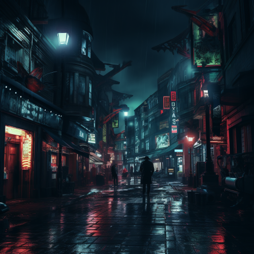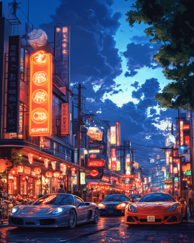 grainy 60s illustration. narrow japanese city street filled with neon signs. it is night. --ar 4:3