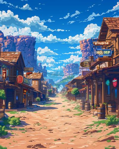 a high resolution cartoon style illustration of A dusty western town with glowing street signs, high-tech shops, and traditional wooden buildings , blue sky, white clouds, afternoon, rendered in a colorful cartoon style, with bright colors and clear lines , well detailed, colorful, eye pleasing --ar 4:5 --s 500 --v 6.0