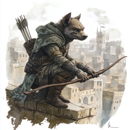 Gnoll ranger with hyena-like features, holding a bow, crouching on a rooftop and watching over a the city. Dark Fantasy setting. The mood is eerie and ethereal. Watercolor art style. The background is a medieval city with some white space around the edges. --ar 3:7