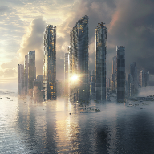 futuristic dystopian skyline of miami with all the shorter buildings collapsed or destroyed, and only the 20 tallest buildings still standing.All the tallest buildings are connected by skyway or walkways that connect skyscrapers around the 50th floor buildings The sea level has risen high enough to cover all the ground with ocean water. the aston martin residences is in the center and stands out in the sun.