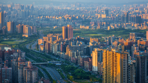 The urban landscape of Taipei City focuses on buildings of different densities, showing the contrast between high-rise buildings and low-density residential areas. The images can include main roads and surrounding green areas, emphasizing land use efficiency and urban space planning. The photos should show the development and prosperity of Taipei City, while retaining a certain amount of open space to reflect the impact of building coverage on the environment. It is suitable for daytime shooting, with bright light and clear buildings.